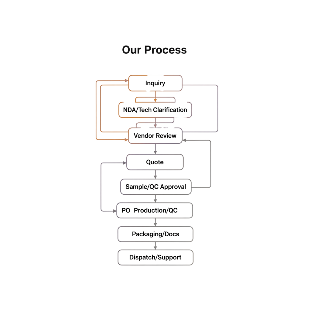We oversee sample manufacturing with detailed inspection reports, perform on-site quality checks before dispatch, and provide dimension reports, surface finish photos, and material certificates as per RFQ.